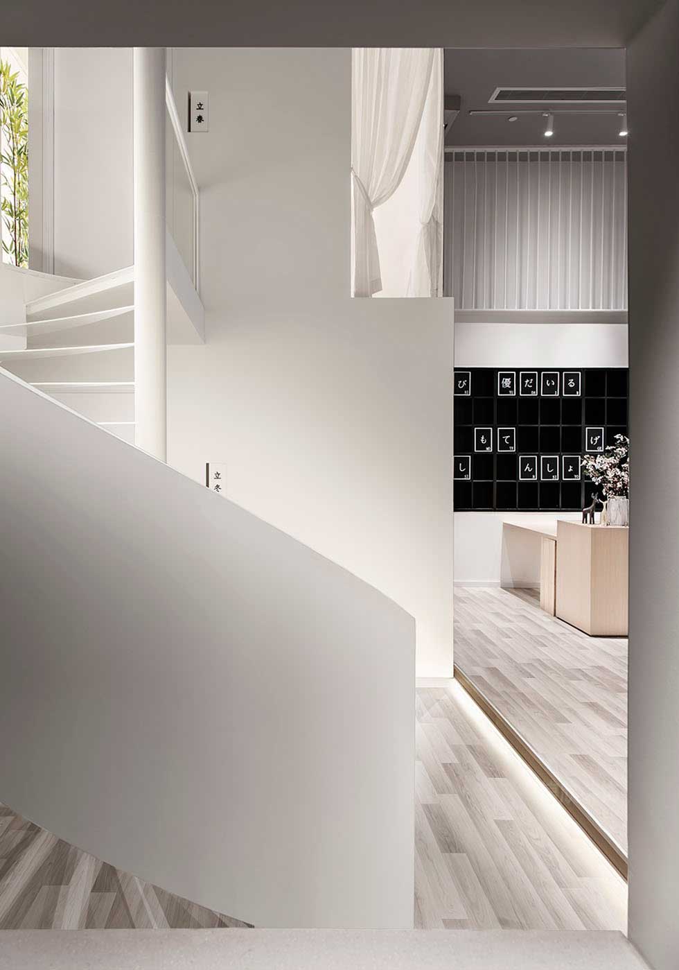 整個(gè)空間入口及休閑區(qū)做了一個(gè)抬高,將空間的公共區(qū)域和內(nèi)部區(qū)域做了一個(gè)劃分。整個(gè)空間的中心點(diǎn)是連接一二層的飄帶狀旋轉(zhuǎn)樓梯。