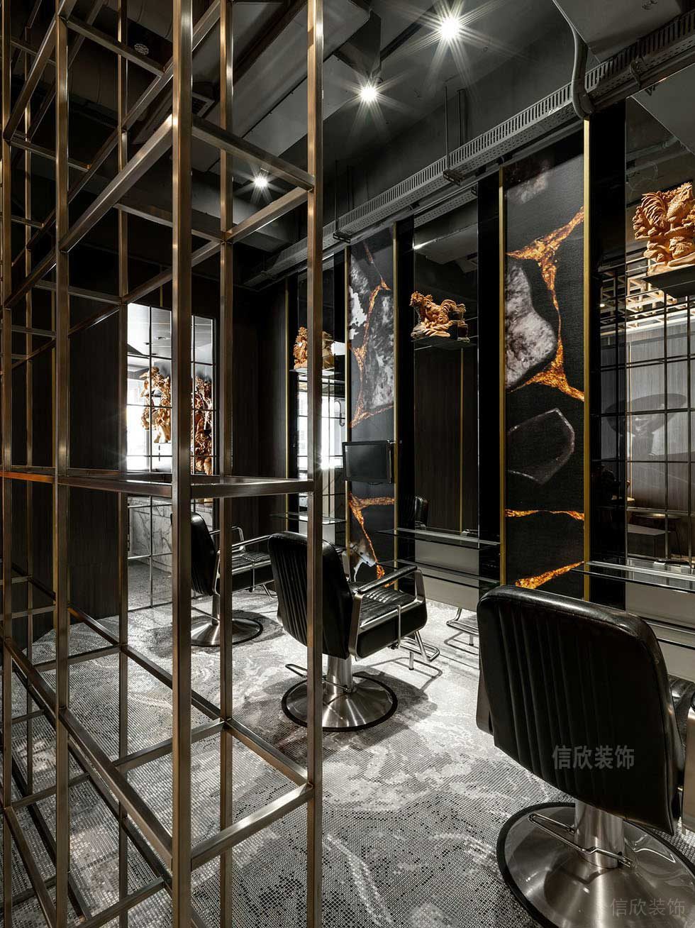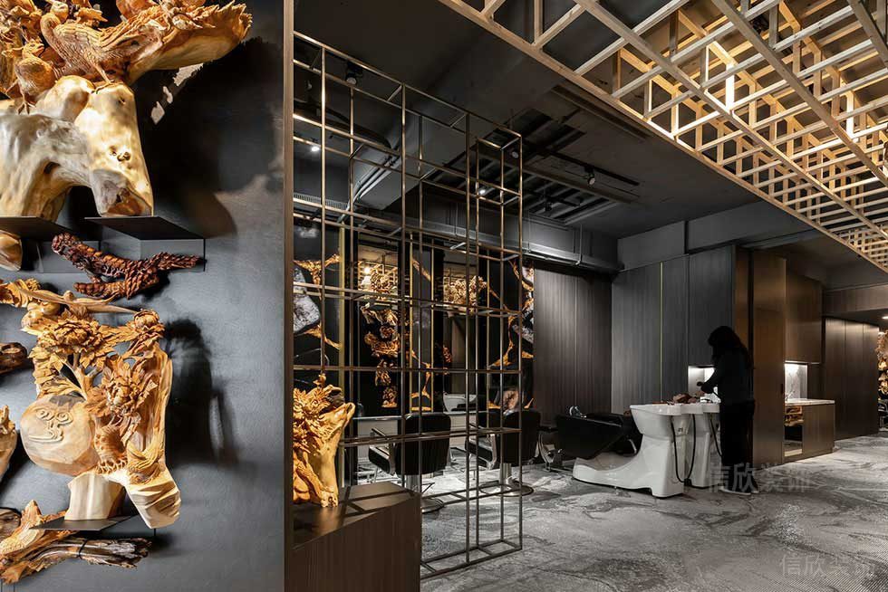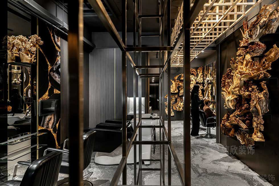 洗頭區(qū)和造型區(qū)放在同一片區(qū)域,可以使整體看起來更完整和和諧,同時(shí)相互又不會(huì)干擾,在金色和黑色兩者色調(diào)的搭配下,簡單中也能體現(xiàn)出潮流和設(shè)計(jì)感的完美組合效果。