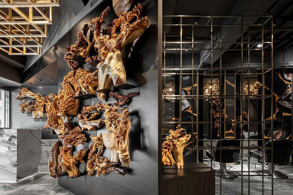 前臺的設(shè)計(jì),選擇和背景墻相同的深色原木背景墻和根雕的結(jié)合,看起來人文氣息和藝術(shù)感強(qiáng)烈,天然石材紋理的前臺,玻璃馬賽克的地面,形成了一副天然的水墨畫的畫風(fēng)。