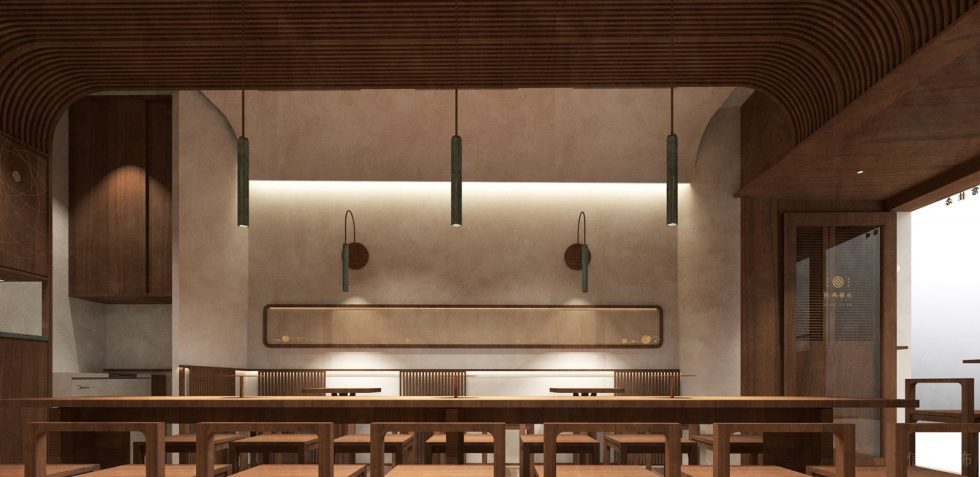 糖水店的深木色弧形格柵天花透露著一種懷舊復(fù)古的韻律感。