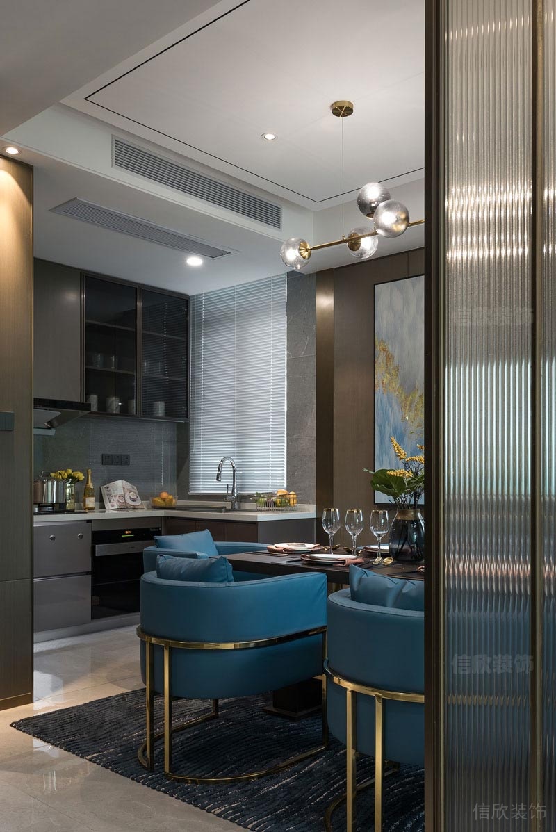 深圳市南山區(qū)星都·梅沙天邸餐廳 開放式廚房的設(shè)計,符合現(xiàn)代開闊大氣的理念,同時空間顯得寬敞而不局限,深色的餐桌,線條優(yōu)美的藍色餐椅,讓整個餐廳立馬變的活潑起來,并且?guī)в袣W式貴族范的優(yōu)雅品質(zhì)。