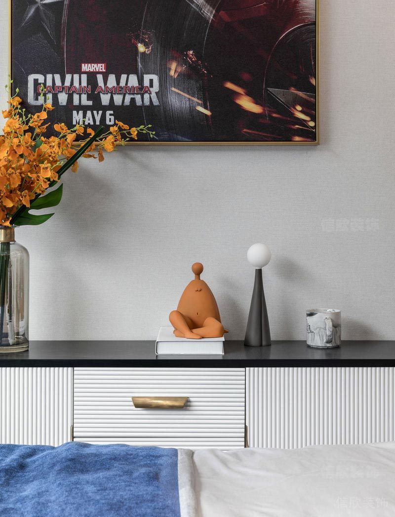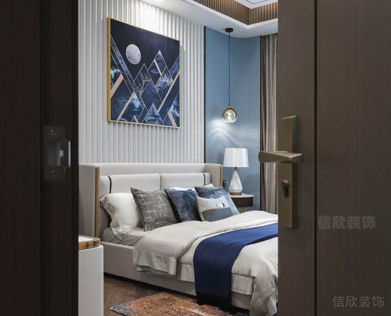 深圳市南山區(qū)星都·梅沙天邸主臥 線條簡潔的白色,如天空般閃耀的淺藍,在抽象畫的潮流元素,古典的布藝床,優(yōu)雅的床頭柜的搭配下,讓整間臥室看起來,色彩秀美,五彩繽紛;舉手投足之間,無比閃現(xiàn)出對品質(zhì)生活的無限向往。