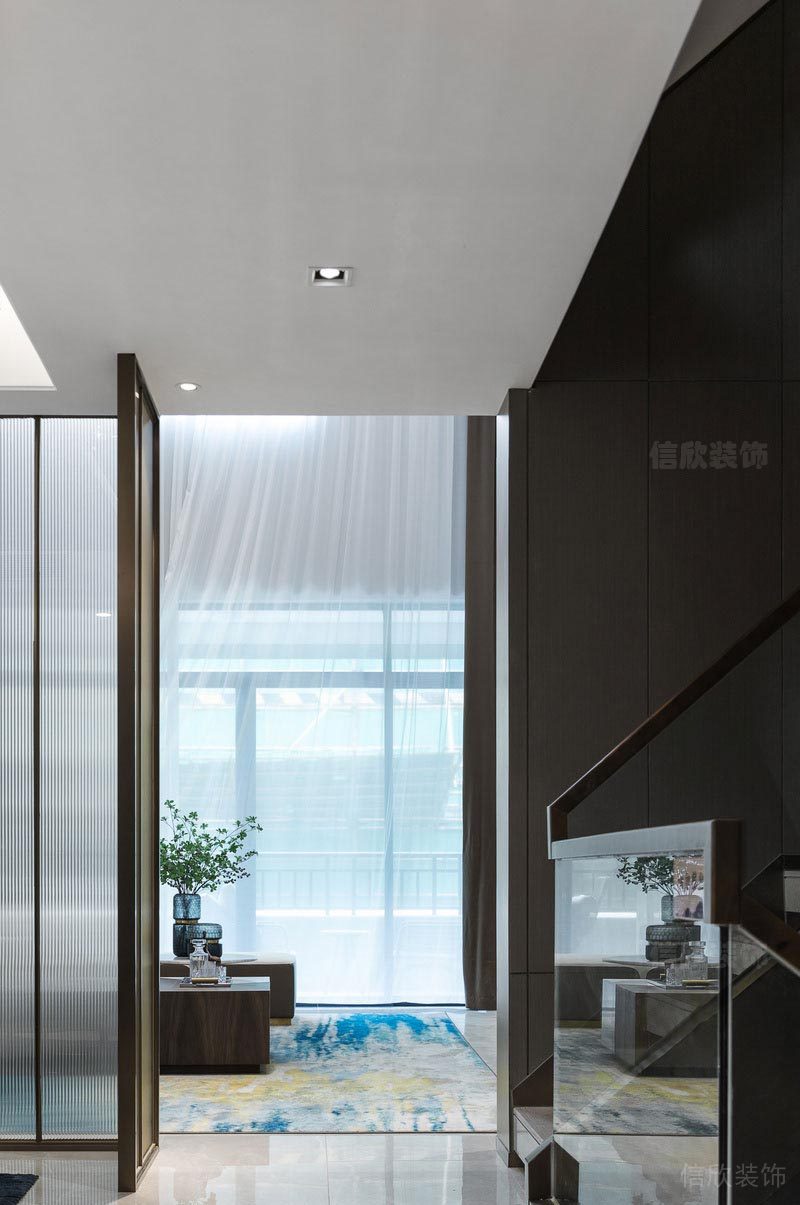 深圳市南山區(qū)星都·梅沙天邸樓梯 黑色玻璃的現(xiàn)代色彩,深咖色木飾面板的深沉簡單,在金屬吊頂?shù)难b點下,立馬變的流光溢彩貴氣十足。