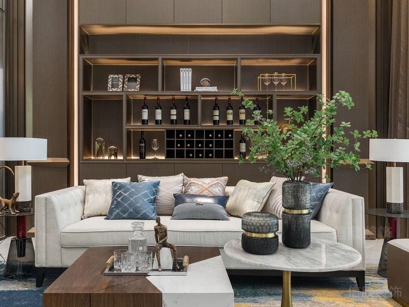 深圳市南山區(qū)星都·梅沙天邸沙發(fā)背景墻 酒柜代替電視背景墻,沙發(fā)不靠墻的設(shè)計方式,增加了空間感和實用性,深咖實木的深沉,金屬線條的時尚,讓整個客廳的格調(diào)立馬得到提升,用優(yōu)美的裝飾,裝點出奢華的效果。
