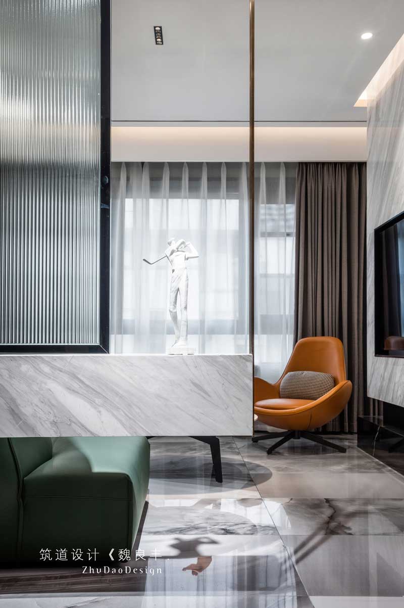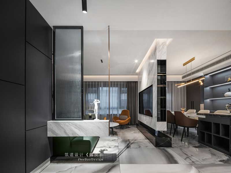 玄關(guān)的設(shè)計,采用懸空式的大理石,加上磨砂玻璃制作的玄關(guān),使空間的功能性更強,起到遮擋的效果,讓客廳有一種猶抱琵琶半遮面的韻味,開啟人們的好奇心。