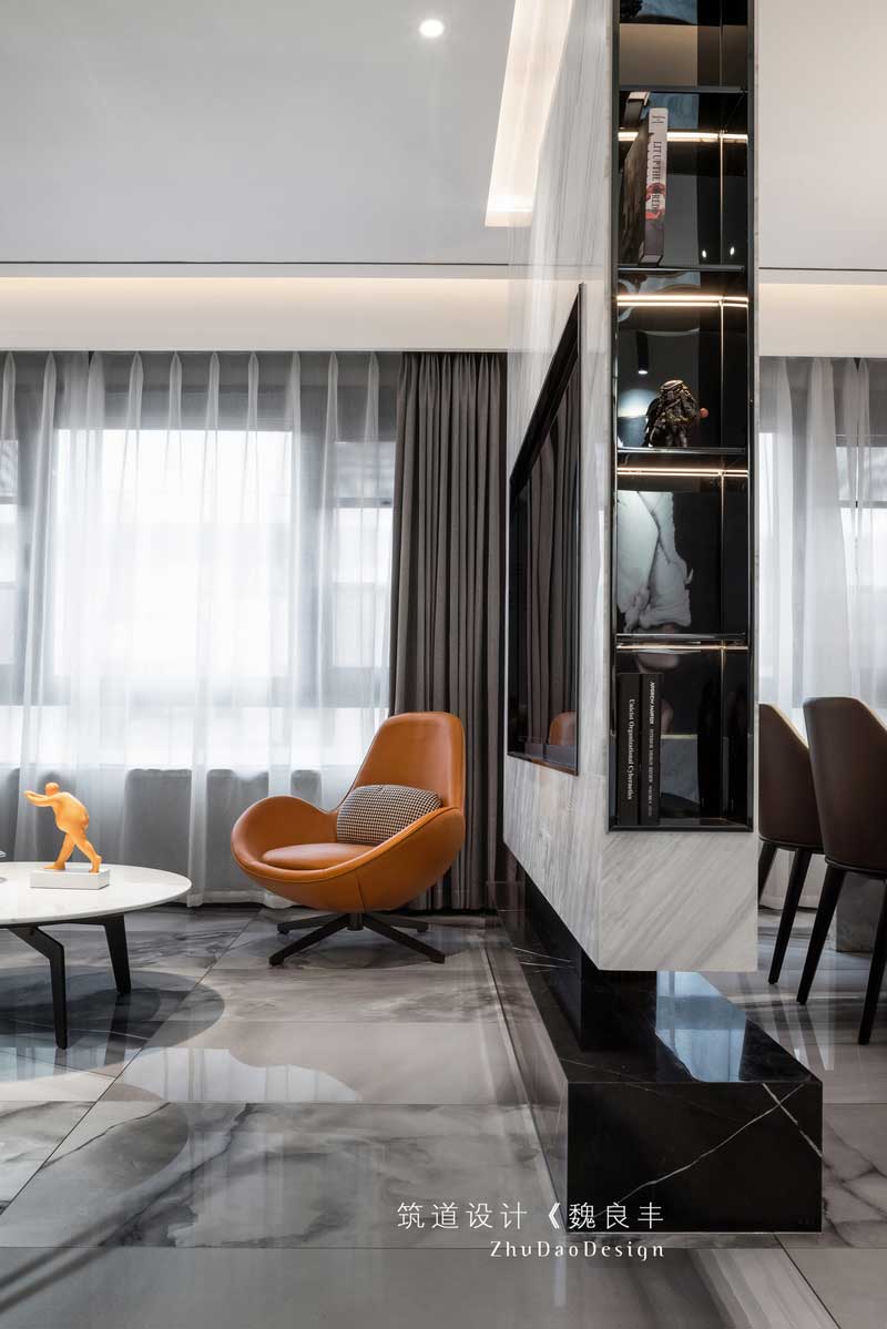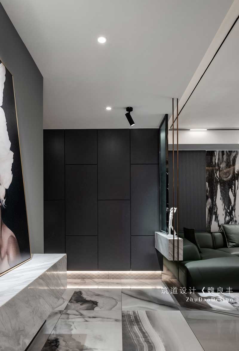 黑色的木飾面護墻板和天然大理石,兩種材質(zhì)之間碰撞,把冷色調(diào)的孤傲和冷酷完美的融合在一起,一眼看上去有一種后現(xiàn)代風(fēng)格抽象畫的文青氣息和特立獨行的氣質(zhì)。