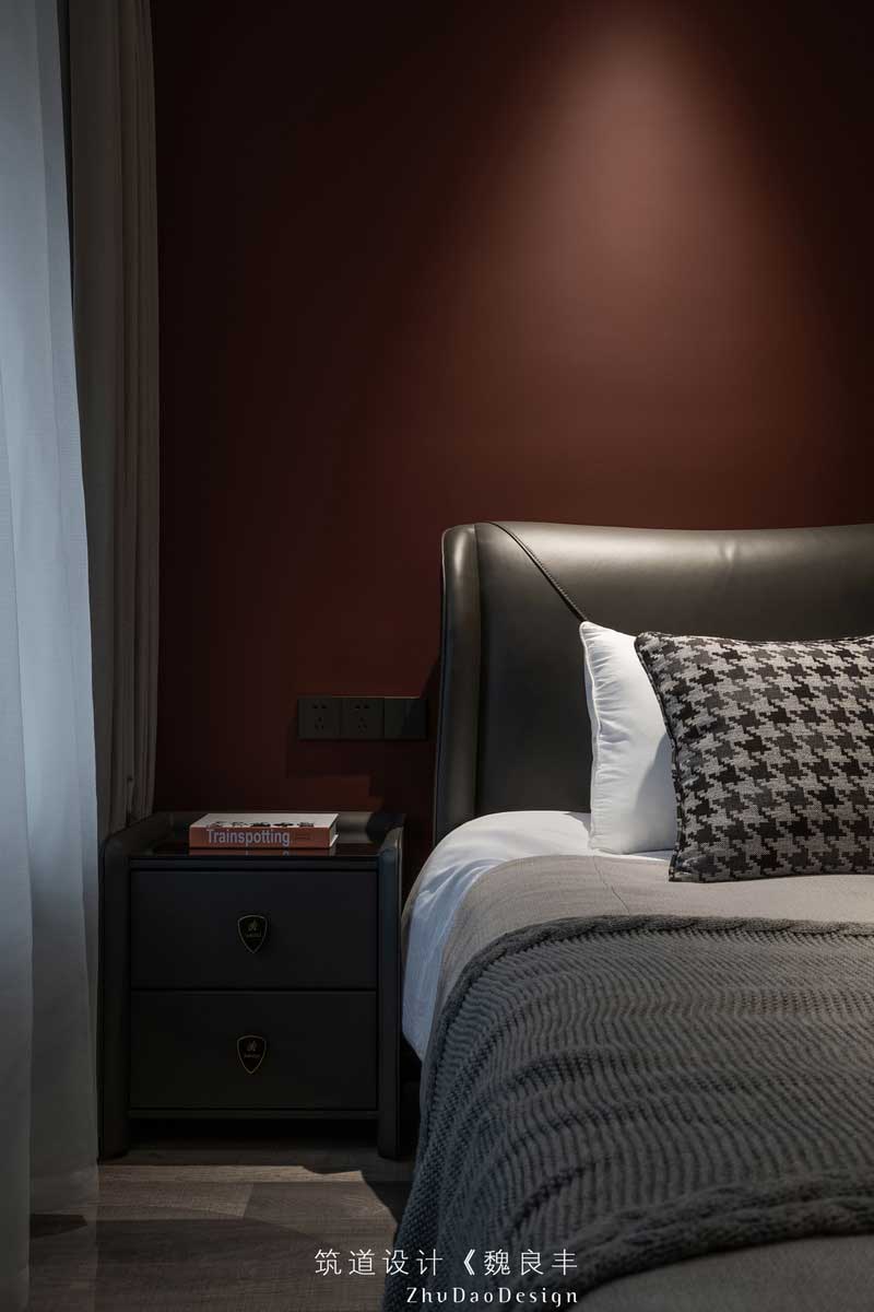 整體的周邊頂,無主燈式樣的設(shè)計,一定程度上起到了降低層高,使整體更充實,更飽滿的效果,深紅色的墻面,讓黑色兩色為主的臥室,增添了一些復(fù)古的色調(diào)感。