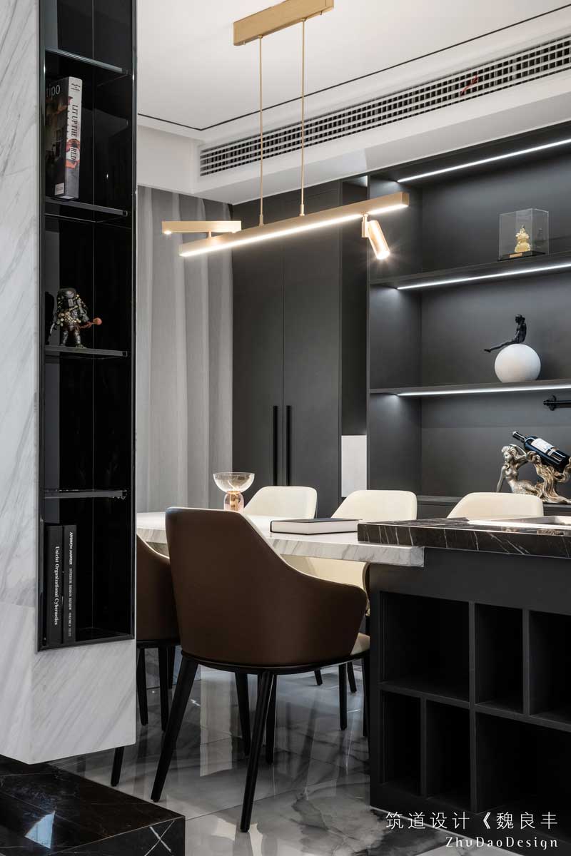 回形吊頂強調(diào)了餐廳的功能性,帶中島柜的設(shè)計,白色和黑色天然大理石的對比,呼應(yīng)了設(shè)計的主題,簡單直接強調(diào)功能性,西式的餐臺增加了生活的調(diào)味劑。