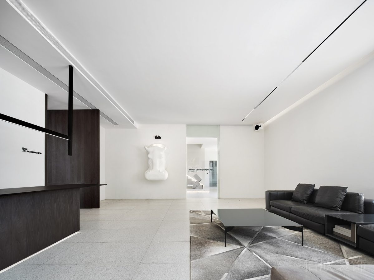辦公室中性色茶水間以開放式的裝修規(guī)劃與一旁的紅色弧形定制沙發(fā)形成了一種融合的協作關系。