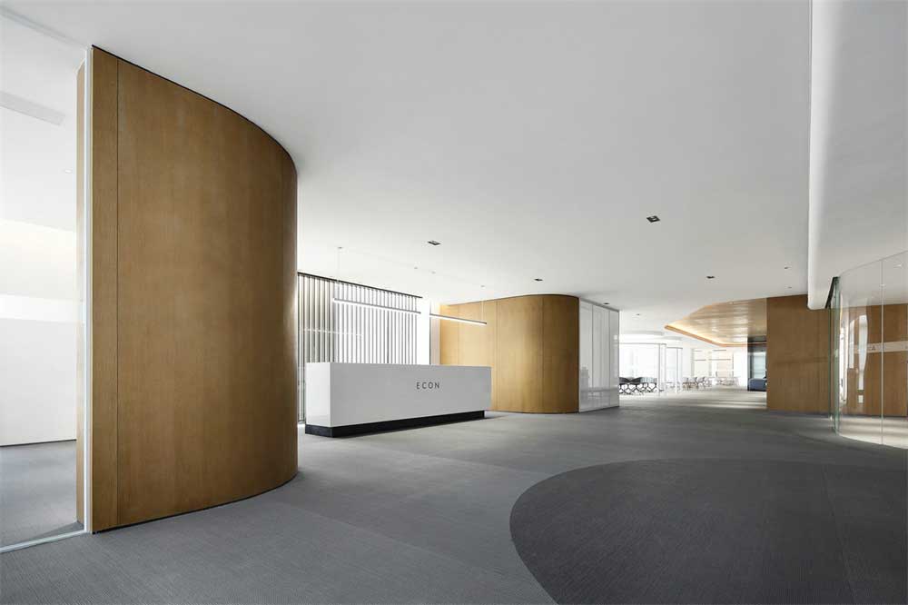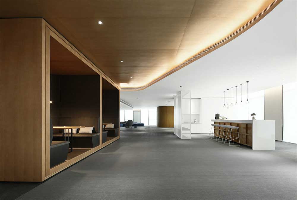 現(xiàn)代風(fēng)格辦公室過(guò)道,開(kāi)闊的過(guò)道弱化了各區(qū)的功能性,木飾面和白色石膏板的吊頂,不規(guī)則的造型更顯時(shí)尚。