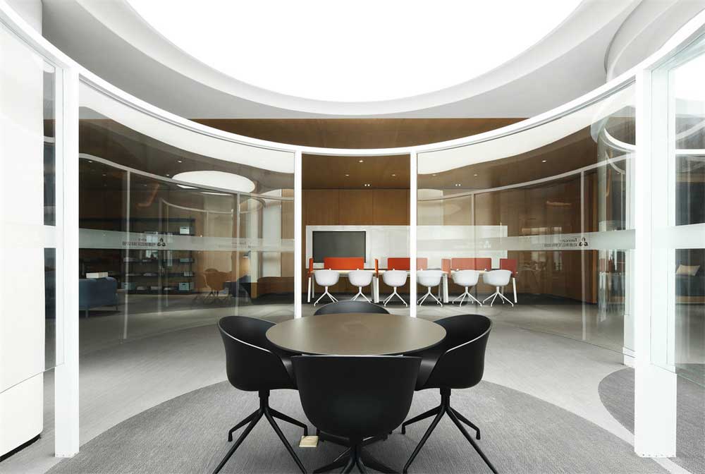 圓形玻璃的小會(huì)議室,黑色如郁金香般的四人小會(huì)議桌,兼具使用性和觀賞性。