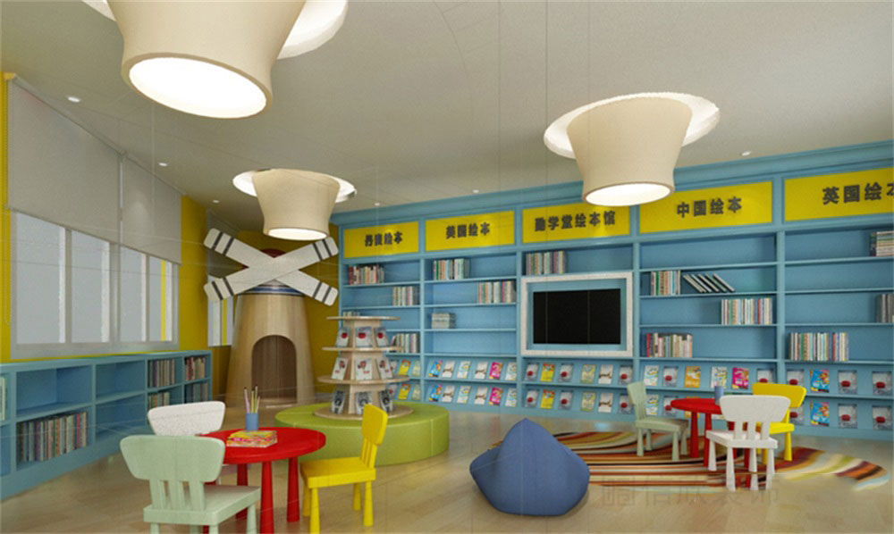 斜三角的休息區(qū),通過天藍色的書架,風車的造型,白色的頂面,給孩子們打造出一個如希臘神話般神奇的小天地。