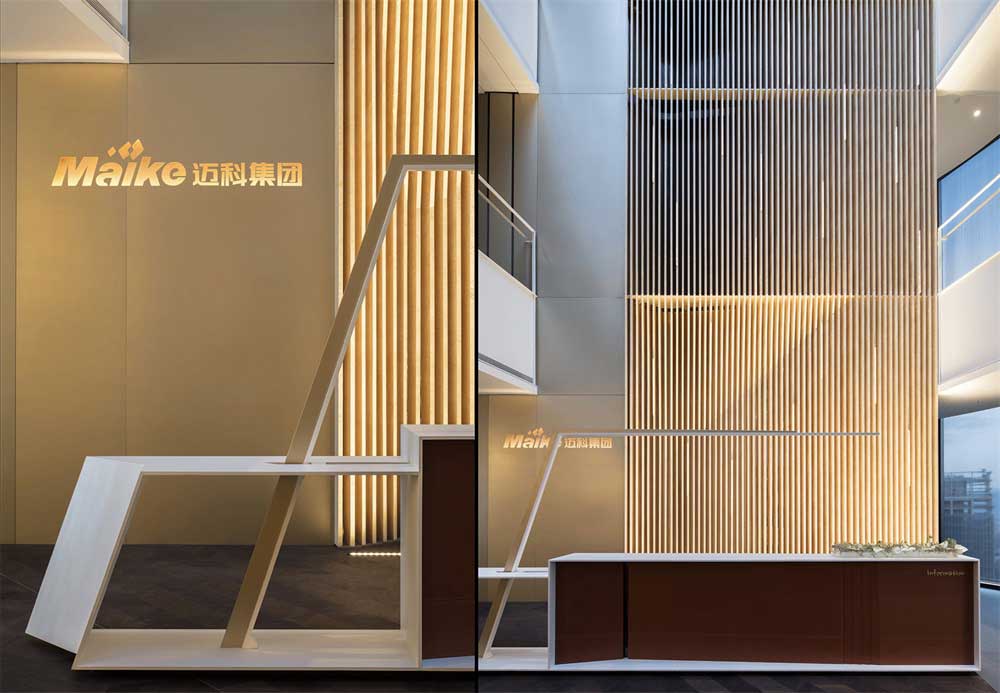 邁科集團(tuán)現(xiàn)代風(fēng)格辦公室前臺(tái),實(shí)木格柵背景墻,造型獨(dú)特的藝術(shù)效果前臺(tái),前衛(wèi)而獨(dú)特。