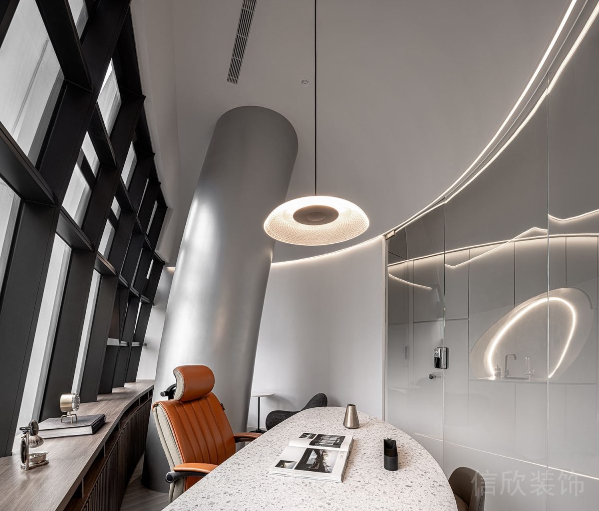 在深圳市龍崗區(qū)布吉左右云創(chuàng)谷,現(xiàn)代簡約風的辦公室裝修設計以其簡潔而富有動感的風格,為辦公空間注入了新的活力。整個空間以清新的白色和沉穩(wěn)的灰色為主調,輔以橙色的休息區(qū),帶來明亮而熱情的氛圍。黑色金屬鏤空墻體為背景增添了獨特的現(xiàn)代感,配合大理石瓷磚地板和木飾面墻體,展現(xiàn)了優(yōu)雅與耐用的完美結合。臺球室與會議室的階梯式天花板設計,不僅為空間增添了層次感,還提升了功能性和視覺沖擊力。工位區(qū)采用白色簡約設計,搭配對稱式布局,既美觀又實用。微景觀環(huán)形裝飾巧妙引入自然元素,營造出舒適的休息氛圍。開放式打印室與黑白色調設計形成鮮明對比,體現(xiàn)高效辦公的現(xiàn)代氣息。金屬格子柜和原木風書柜提供了充足的儲物空間,同時融入了原木的自然溫馨感。整體設計通過流暢的線條和精致的細節(jié),完美融合了舒適與現(xiàn)代,打造出一個既實用又充滿創(chuàng)意的辦公環(huán)境。