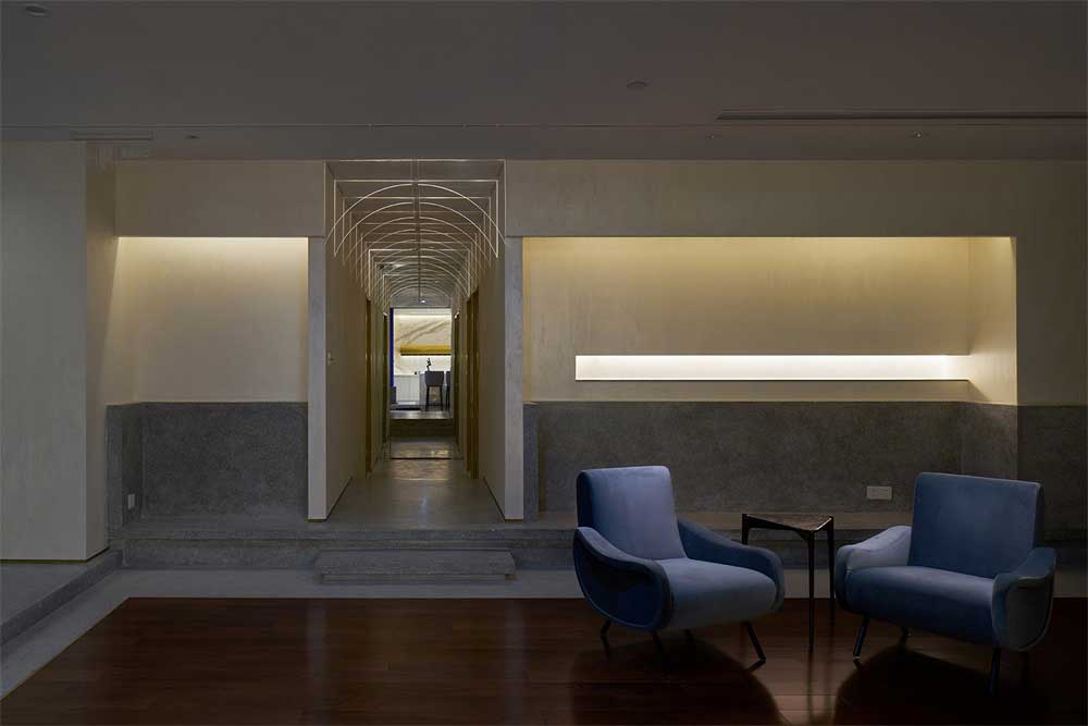 過道的裝修設(shè)計,灰色水泥墻凸顯肌理,透明的亞克力玻璃制造出的拱形門質(zhì)感,如水晶般發(fā)散著光輝。