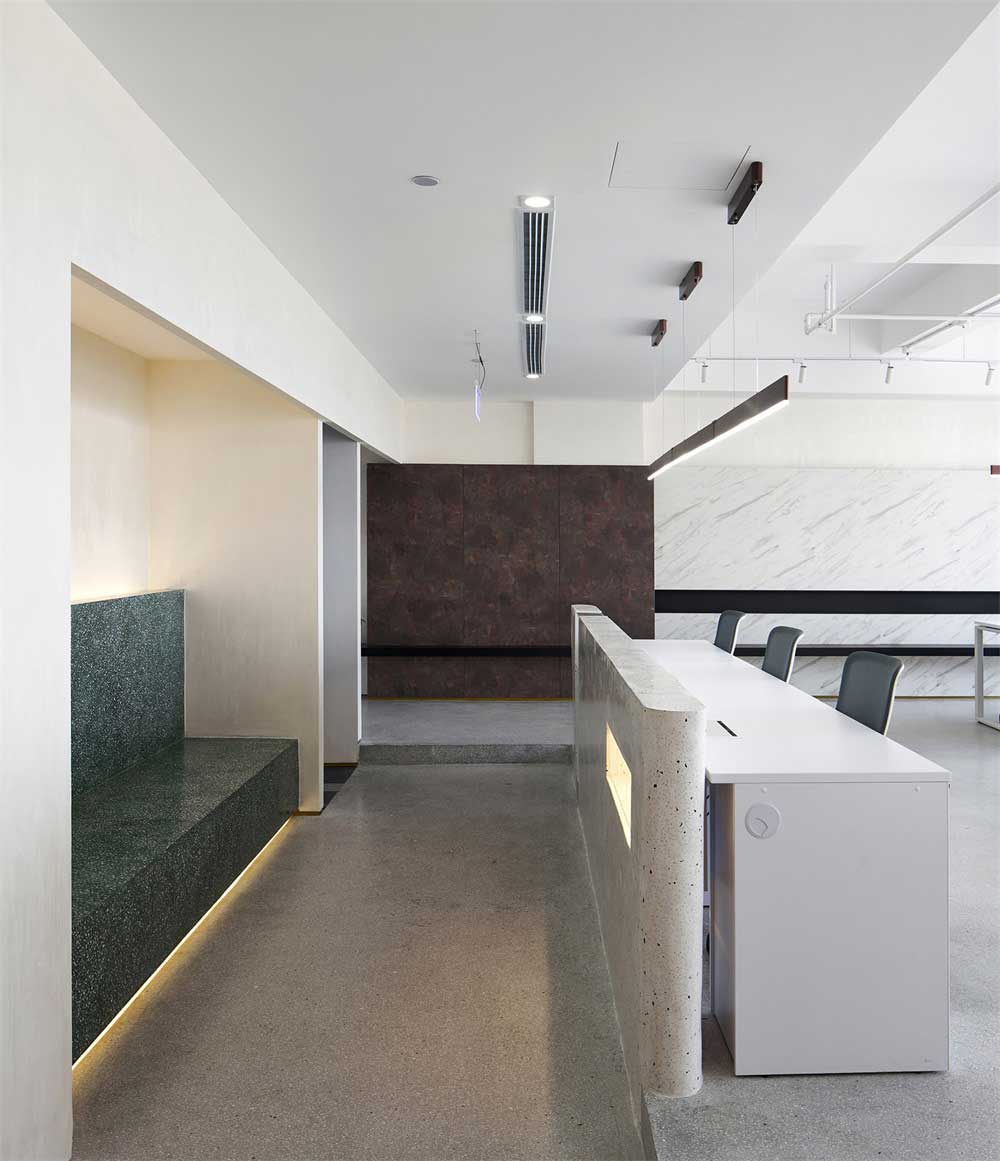 設(shè)計理念:本案是一所現(xiàn)代風(fēng)格的辦公室裝修設(shè)計案例,以簡單的陳列代替復(fù)雜的設(shè)計來體現(xiàn)空間的質(zhì)感,通過不同材料的組合,和合理的空間劃分,讓辦公室看起來充斥著現(xiàn)代的潮流感和時尚的設(shè)計,同時在細節(jié)方面做的非常到位,以精美的軟裝設(shè)計理念,使得整體的檔次得到一個質(zhì)的飛躍。辦公室入戶的區(qū)域,以幾扇現(xiàn)代藝術(shù)的玻璃門和光影的無規(guī)律組合,起到了隔斷入戶和門廳的區(qū)域分隔效果,但是看起來藝術(shù)性十足。過道的設(shè)計,用灰色水泥,和亞克力玻璃材料的結(jié)合,給人一種流光溢彩的拱形門的既視感。廳面設(shè)有白色天然石材紋理的背景墻,和小碎花顆粒的吧臺,把石材的天然肌理展示出來,讓吧臺成了辦公室一道美妙的風(fēng)景線。辦公區(qū)則以白色作為主題色彩,盡可能的保留了原始工業(yè)感的結(jié)構(gòu),僅僅做了刷白和刻意裸露的管道和軌道吊燈,讓辦公區(qū)顯得光線飽和度極高,充足的光照效果,使的面積更開闊,工作起來氣氛更輕松和舒暢。