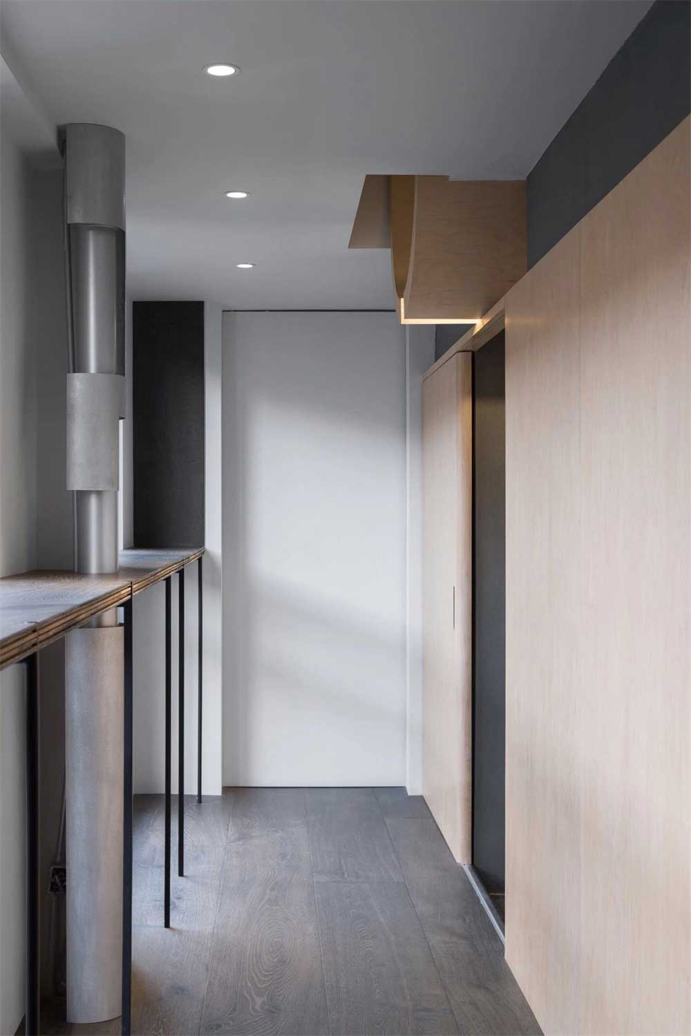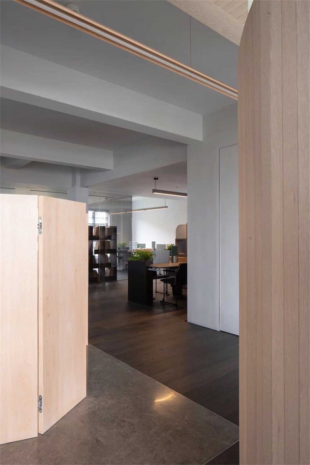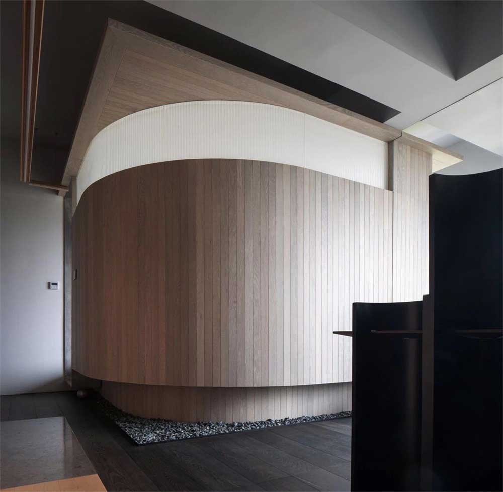 原木風(fēng)辦公室裝修設(shè)計(jì)門廳,黑色的實(shí)木護(hù)墻板,頂面不規(guī)則的圖形設(shè)計(jì),長型的吊燈,在光影下更能體現(xiàn)細(xì)膩的情懷。