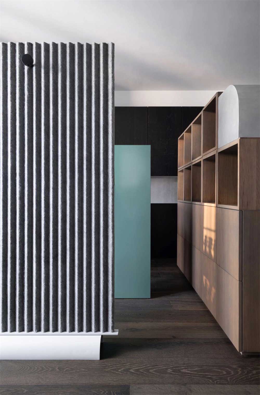 辦公室內(nèi)設(shè)有:洽談區(qū),接待區(qū),會(huì)議室,吧臺(tái)區(qū),開放式辦公區(qū),衛(wèi)生間,整體采用原木系的設(shè)計(jì)風(fēng)格,營造出一個(gè)設(shè)計(jì)獨(dú)特,親近自然,生活狀態(tài),創(chuàng)意新穎的辦公室裝修設(shè)計(jì)案例。入戶門廳采用黑色實(shí)木的護(hù)墻板,上面顯示銀色的LOGO,讓LOGO更亮眼和醒目。 接待區(qū)頂面保留了原始的結(jié)構(gòu),只做了簡單的噴白處理,展示柜通過實(shí)木藝術(shù)的造型,給人一種新穎的設(shè)計(jì)感。洽談區(qū)通過抬高地臺(tái)的方式和過道區(qū)域做了區(qū)分,黑色大理石地面和黑色實(shí)木地臺(tái)的結(jié)合,很有一種復(fù)古的情懷。接待區(qū)迎著陽臺(tái)的方向,保證了空氣的流通和充足的陽光,日式榻榻米的設(shè)計(jì),一進(jìn)來就能讓客戶感覺到高端和被重視的感覺,會(huì)議室和辦公區(qū),采取開放式的設(shè)計(jì)方式,消除了傳統(tǒng)的空間局限性,更方便工作中的交流與合作。
