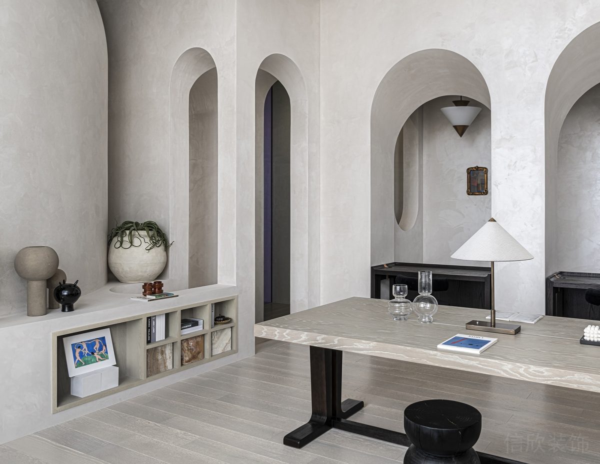 結(jié)合木飾面材質(zhì)的內(nèi)嵌儲物柜設(shè)計,不僅節(jié)省了空間,還增加了實用性。