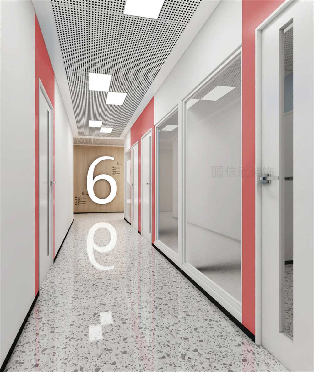 過(guò)道采用格柵頂加人造石地面的鋪設(shè),再加上綠色的點(diǎn)綴,清爽干凈,原木色的logo醒目,有一種簡(jiǎn)潔的高級(jí)感。