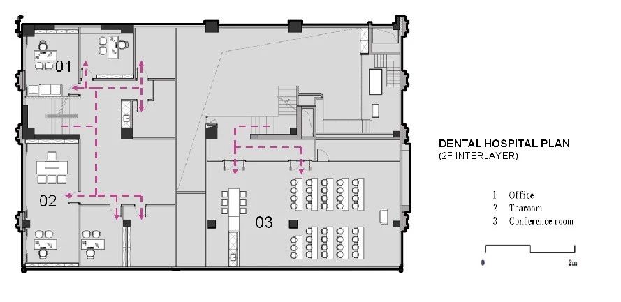室內(nèi)的墻面具有不同的透明度:從等候區(qū)域可以看到接待臺(tái)后方的診區(qū);實(shí)驗(yàn)室和器材消毒中心的部分玻璃隔墻覆蓋以半透明的白色薄膜,為醫(yī)務(wù)人員提供了半私密的工作環(huán)境。傳遞了診所公開透明的理念。