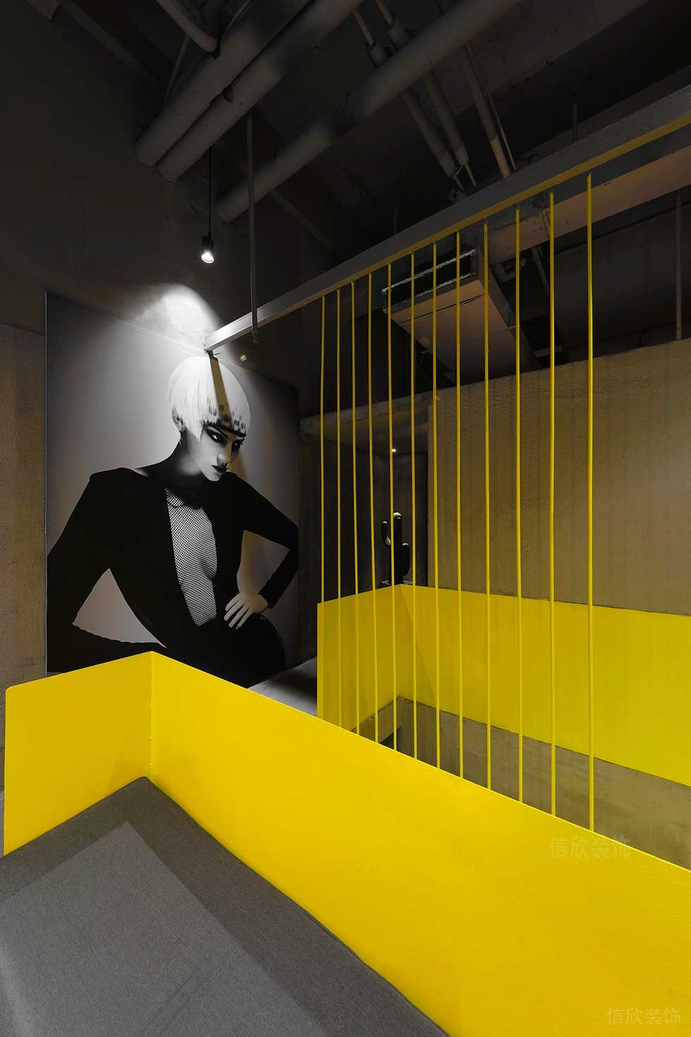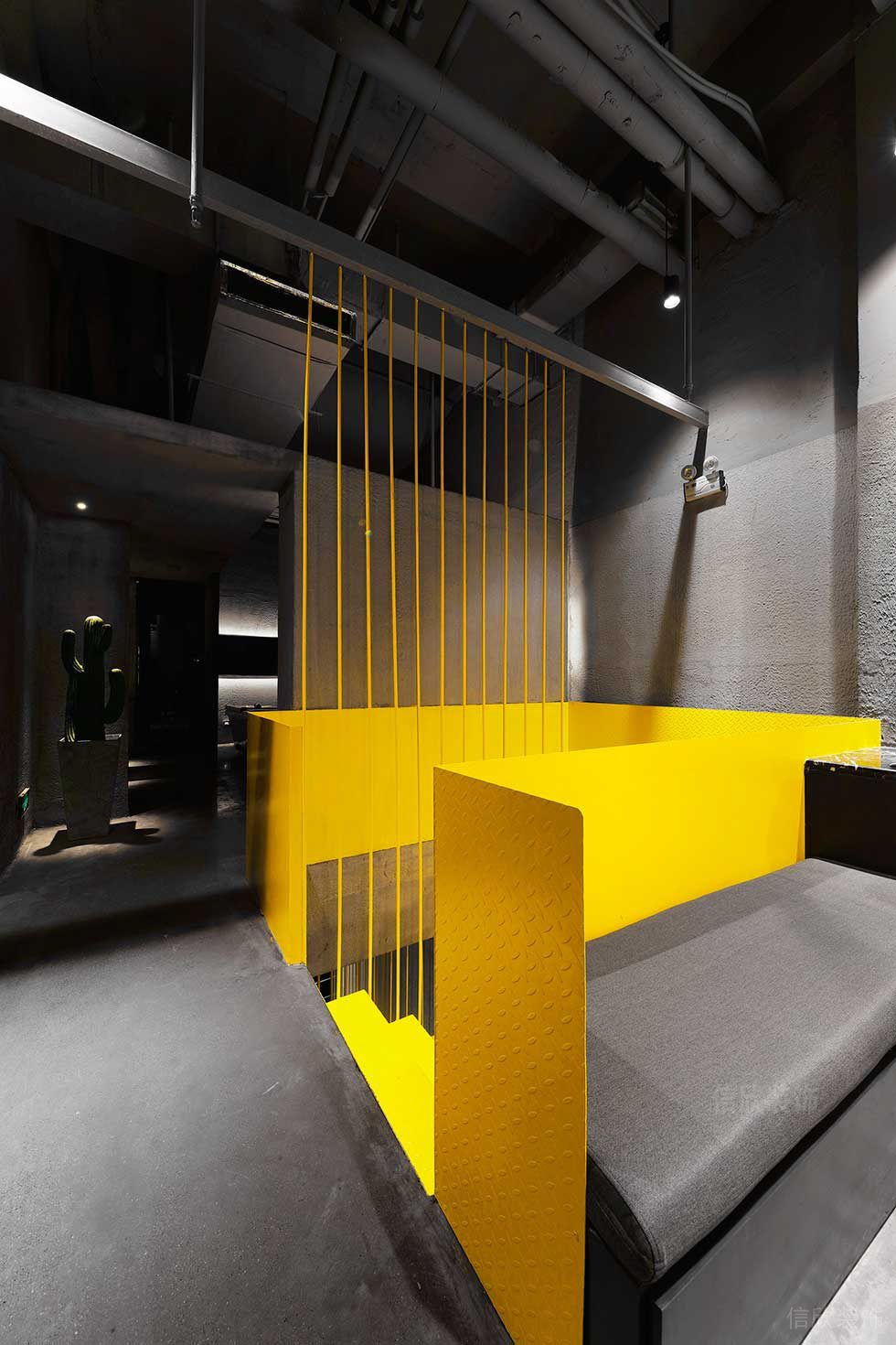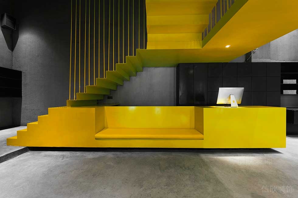 黃色的前臺,如陽光板明媚和閃耀的顏色,在灰色水泥結(jié)構(gòu)和黑色的整體空間,猶如注入了一絲耀眼的光芒,色彩絢麗,顯得時尚而美觀。