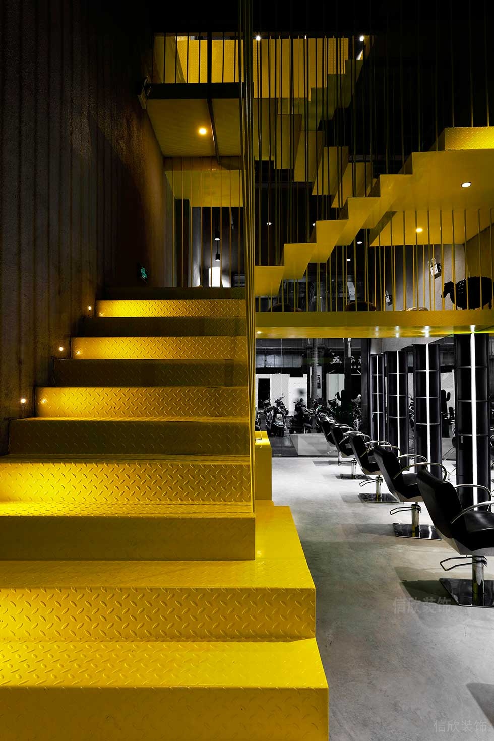 由外往內(nèi)一望,巨大的黃色樓梯裝置如雕塑般躍然于空間之中,強烈的視覺沖擊力營造出新都市時尚感,油然而生的想法:這是一個很酷的美發(fā)空間。