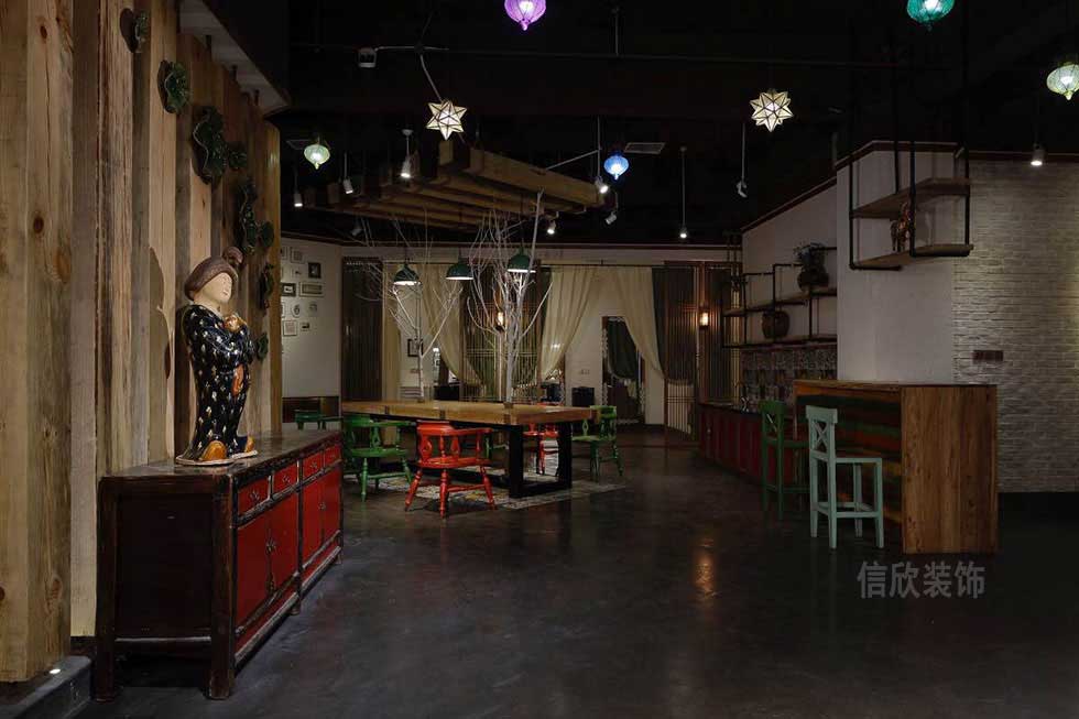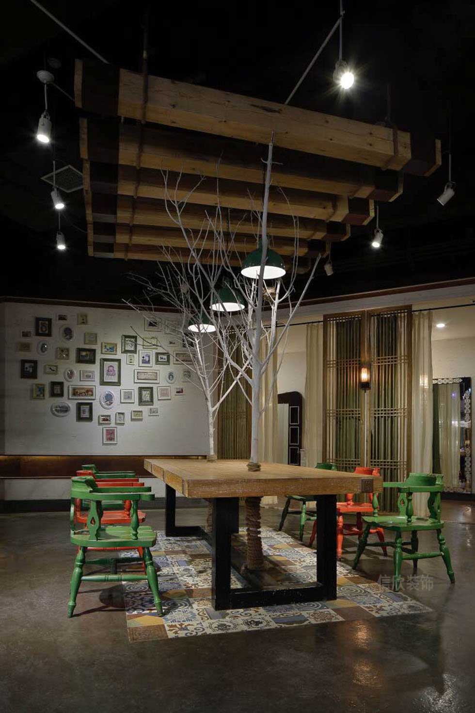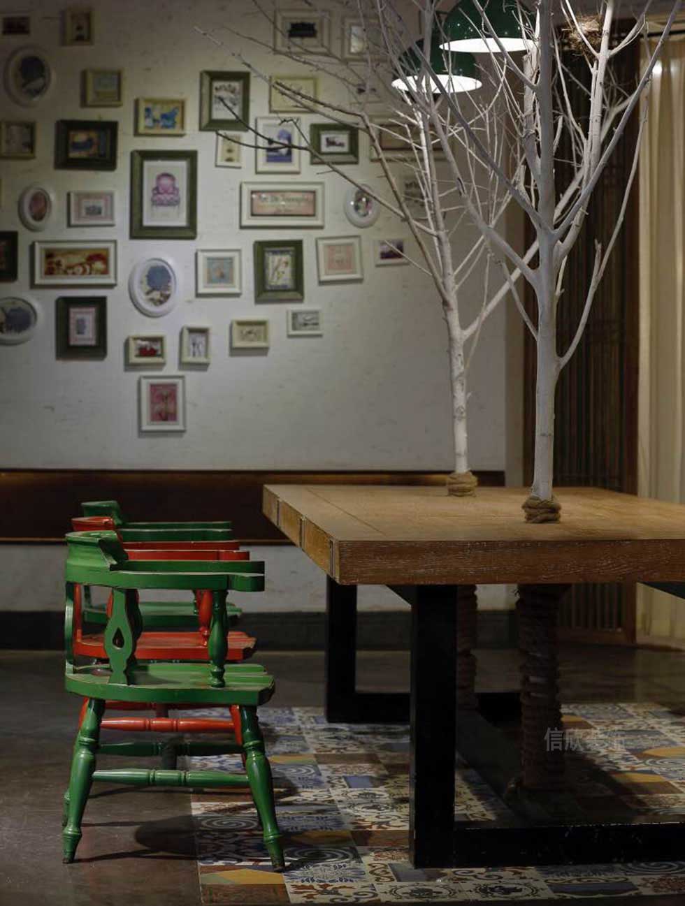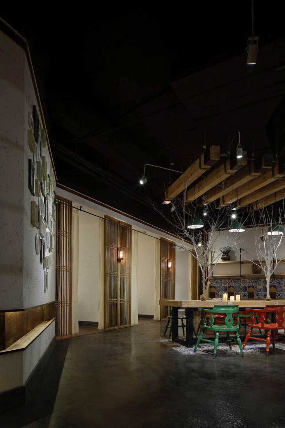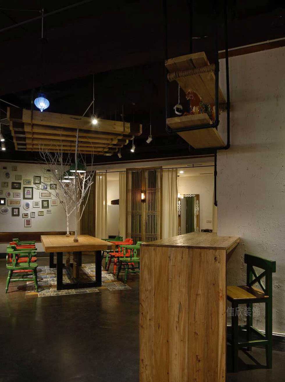 原始頂面的基礎(chǔ)上,加了實木格柵吊頂,降低了層高的同時也凸出了空間感,古舊的桌椅,加上枯枝的桌面擺件,給人一種獨特的東方文化的神秘感。