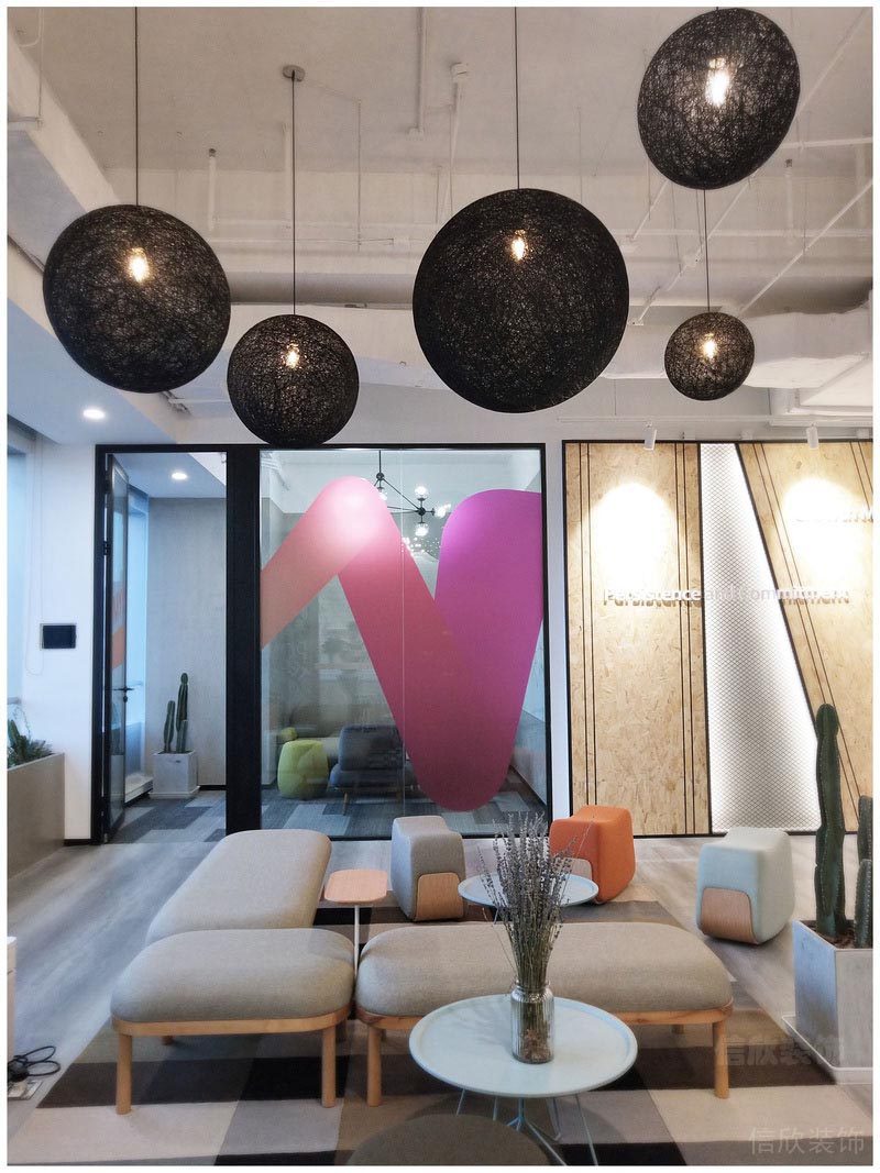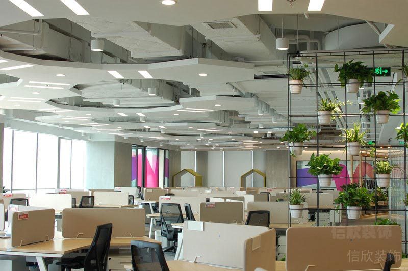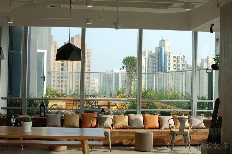 本案位于深圳市是一所田園風格的辦公室裝修設(shè)計案例,在墻面上大量使用玻璃墻,使空間的通透性強,人們可以通過玻璃看到窗外的世界,使辦公空間與室外自然環(huán)境在一定程度上達到相互融合。同時,室內(nèi)植物在陽光的照射下形成自然的光影,對辦公空間有一定裝飾性。