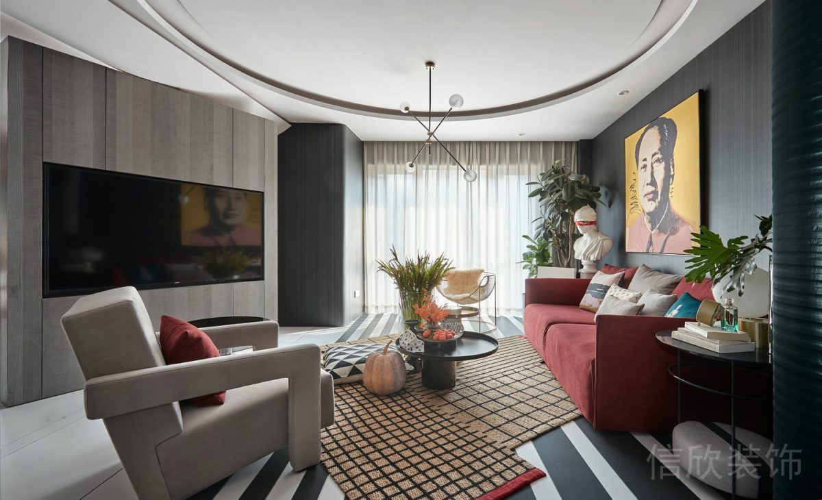 現(xiàn)代創(chuàng)意設(shè)計(jì)全屋定制客廳裝修紅色沙發(fā)效果圖地毯過道條紋黑白色調(diào)設(shè)計(jì)圖
