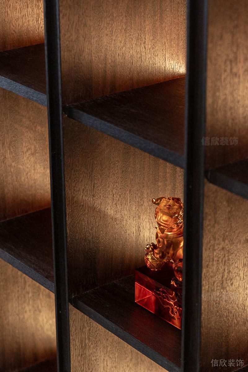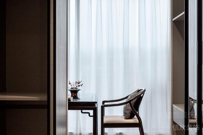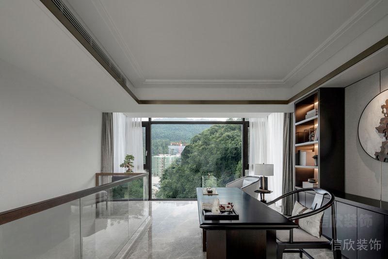 深圳市西鄉(xiāng)書房 書房的設(shè)在樓梯轉(zhuǎn)角的開放式空間上,既通透又明亮,符合中式設(shè)計(jì)的特點(diǎn),采用了古色古香的黑胡桃木書桌的和書桌,讓您靜思閱讀的時(shí)候;可以可以細(xì)細(xì)感受中華文化所獨(dú)特的書香氣。