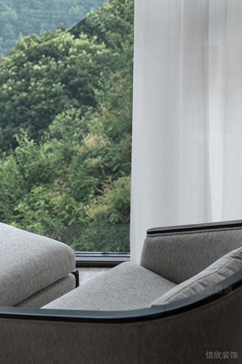 深圳市西鄉(xiāng)客廳 首層是一個(gè)既開放又相對獨(dú)立的功能空間,客餐廳連為一體,兩端大面積的落地玻璃,實(shí)現(xiàn)了室內(nèi)外空間的最大化接壤,人的視野得以連續(xù)與向外延伸。軟裝整體為素雅的暖灰色調(diào),通過經(jīng)典的中國紅來進(jìn)行點(diǎn)綴,打破沉悶的氛圍,讓空間更富生機(jī)與活力,于簡潔素凈之中,顯露雅致與穩(wěn)重并存的東方性格。
