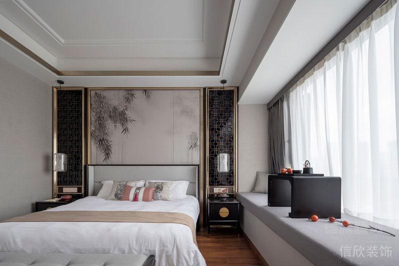 深圳市西鄉(xiāng)主臥背景墻 古典雅致的實(shí)木鏤空雕花屏風(fēng)、富有東方氣韻的淡彩墨竹壁畫背景,以及半透明的玻璃床頭吊燈,相互映襯,盡顯清雅與平和,展現(xiàn)著東方人文精神的傳承與蛻變,以豐富的細(xì)節(jié)展現(xiàn)出低調(diào)卻極富藝術(shù)性的生活品位。