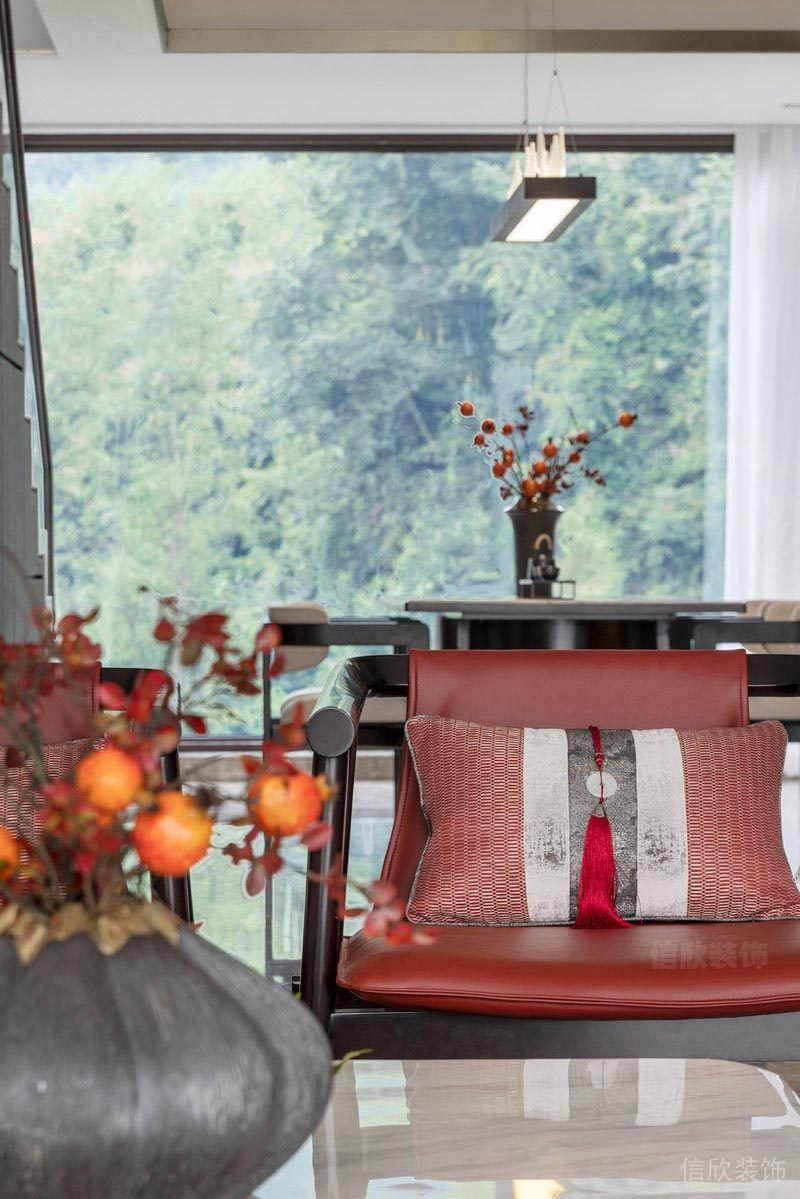 深圳市西鄉(xiāng)客廳 穿過玄關(guān),進(jìn)入過廳,左邊便是餐廳。實(shí)木布藝軟包座椅,極具設(shè)計(jì)感的扶手造型,碩果累累的鮮紅色石榴花藝,精致典雅的陶藝茶具,散發(fā)著濃郁的東方文化情懷。餐桌上方的半透明亞克力山形吊燈,與窗外的青山遙相呼應(yīng),在與自然的對話中,感受“久在樊籠里,復(fù)得返自然”的那份閑適與自在。