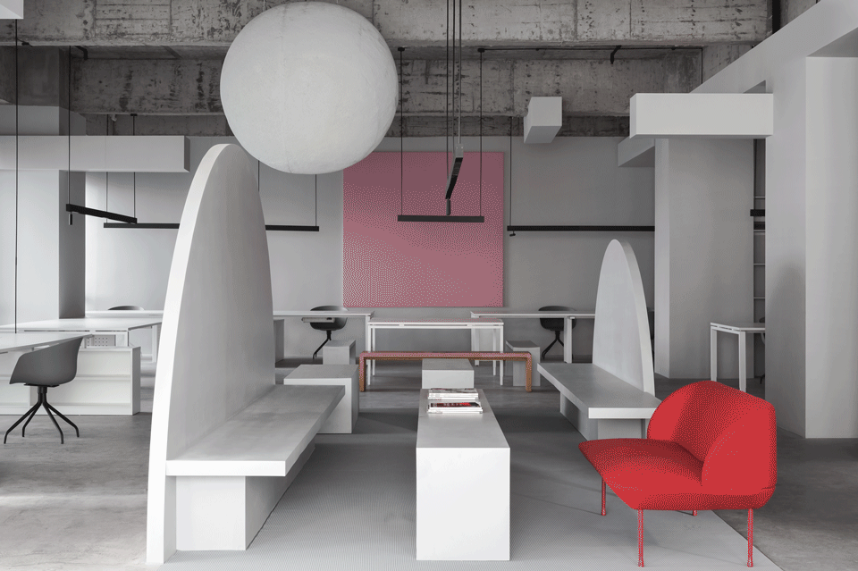 工業(yè)風(fēng)公共辦公區(qū),環(huán)氧地坪漆,白色現(xiàn)代化辦公桌,灰色軟包隔斷,黑色噴漆不銹鋼工業(yè)風(fēng)吊頂。
