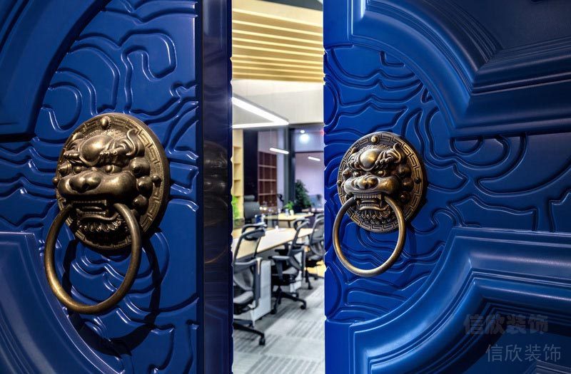 寶石藍色調(diào)的藝術(shù)雕花門板將過去和現(xiàn)在銜接了起來,表現(xiàn)出公司的企業(yè)底蘊跟時代發(fā)展性,讓人在門外也能感受到公司的特性。