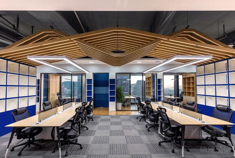 深圳南山現(xiàn)代中式風格辦公室員工辦公區(qū)的天花,一種是顏色較深的木紋鋁扁通,一種是顏色較淺的木紋鋁扁通,兩種明度不一的木色、不一的紋理形成了對比,既統(tǒng)一又不單調(diào)。