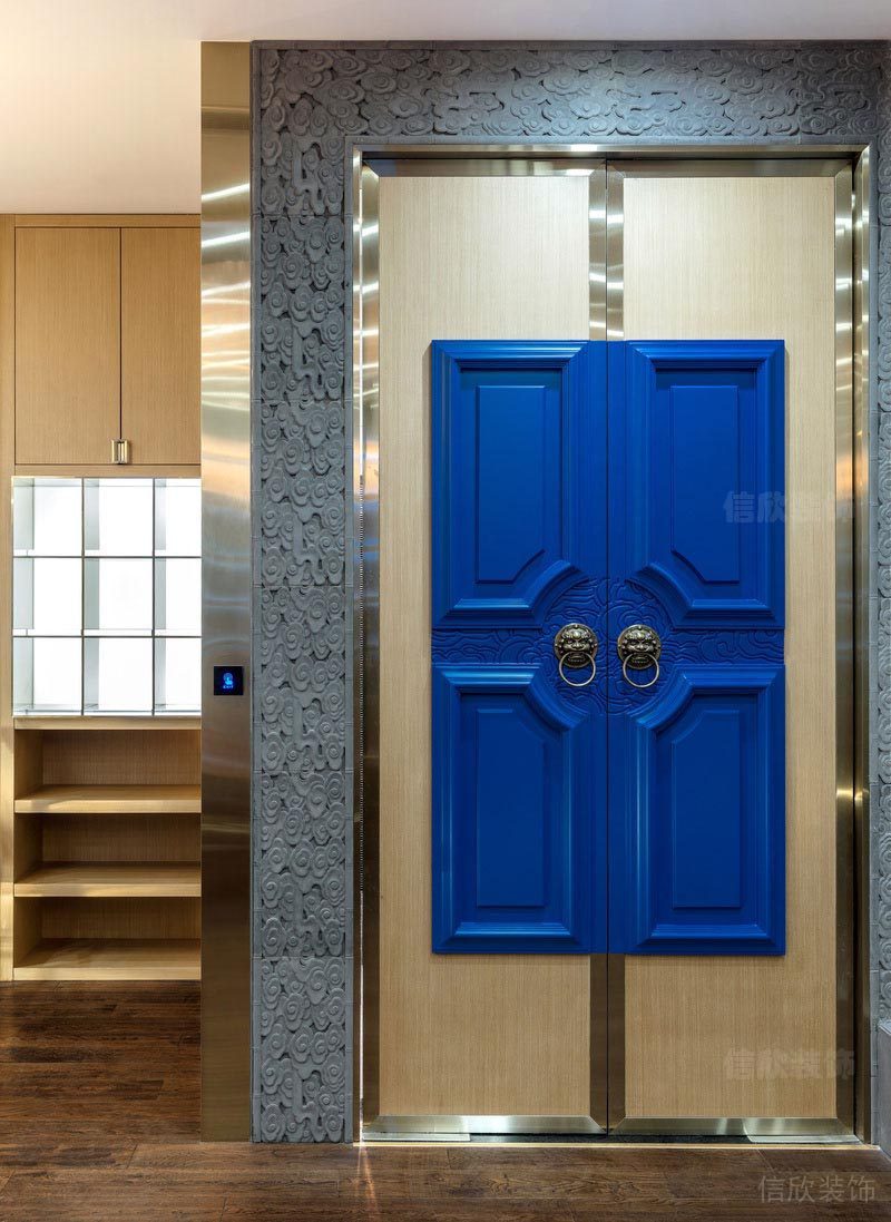 大門是以鋼化玻璃與寶石藍造型木相結(jié)合的,加以古銅的虎獅造型的門叩,運用現(xiàn)代的手法和材質(zhì)還原了古典氣質(zhì),既顯示了中式韻味,又體現(xiàn)了現(xiàn)代風格的與時俱進。